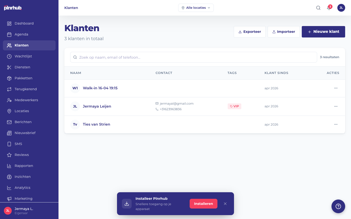Open een steekproef van de geimporteerde klanten en controleer of de velden kloppen. Stuur eventueel een welkomstmail waarin je vertelt dat de salon nu met Plnrhub werkt en linkt naar de nieuwe boekingspagina.